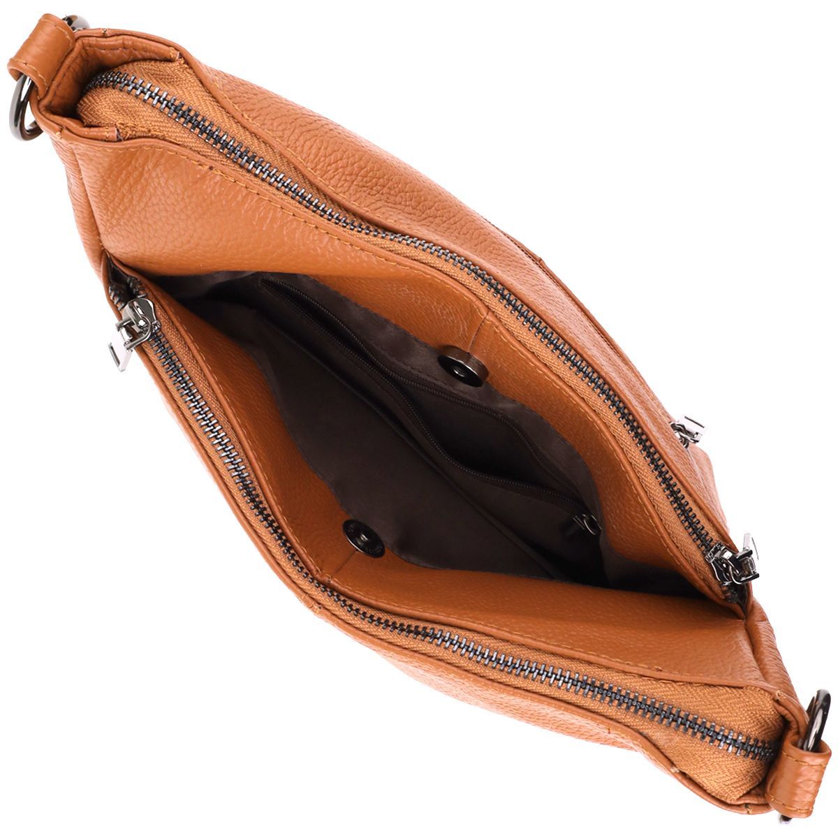 Сумка оснащена трьома основними відділеннями: центральне закривається на магнітну кнопку, а два бічні - на блискавці. Таке рішення забезпечує зручну організацію внутрішнього простору та швидкий доступ до потрібних речей.