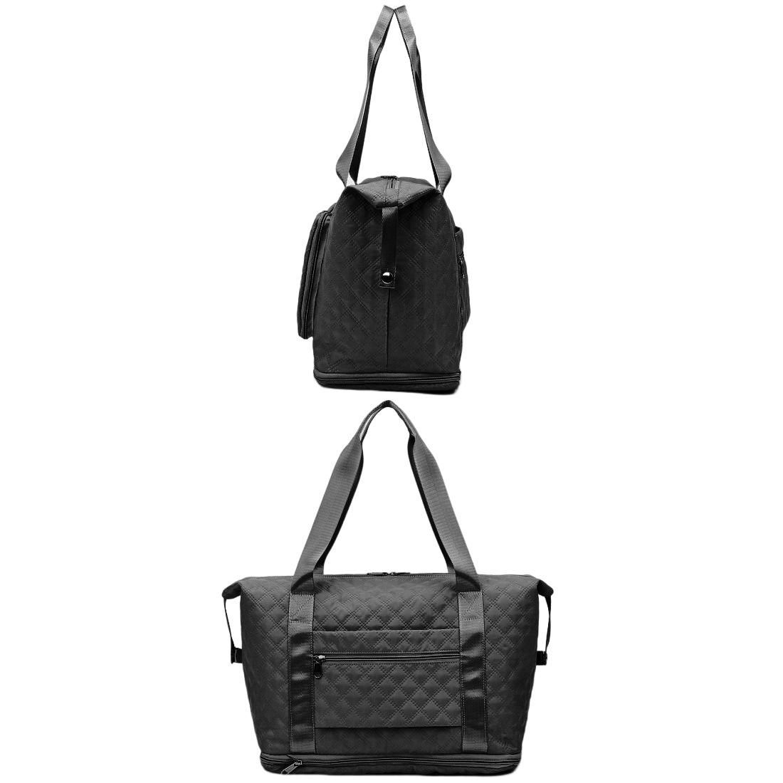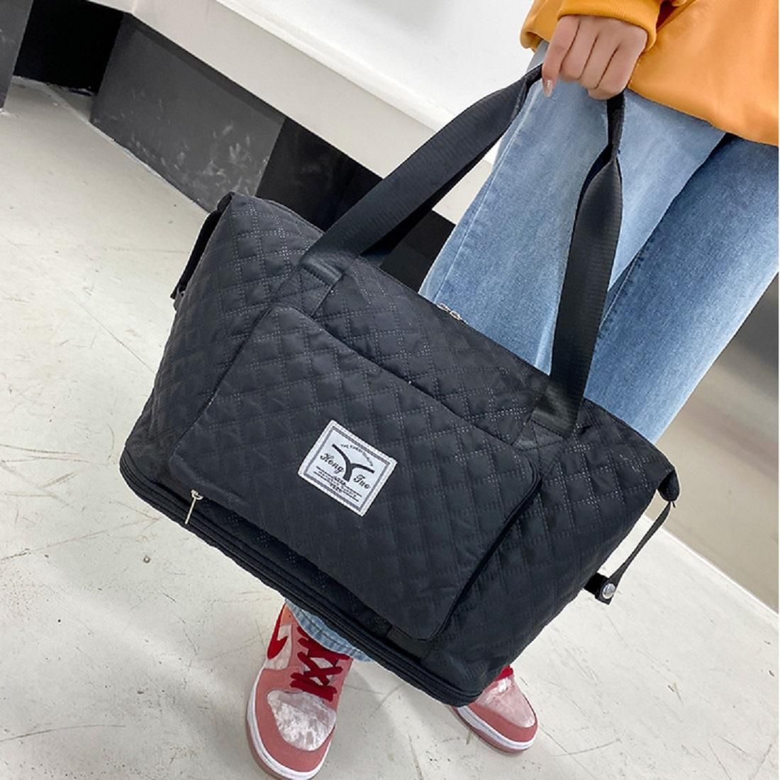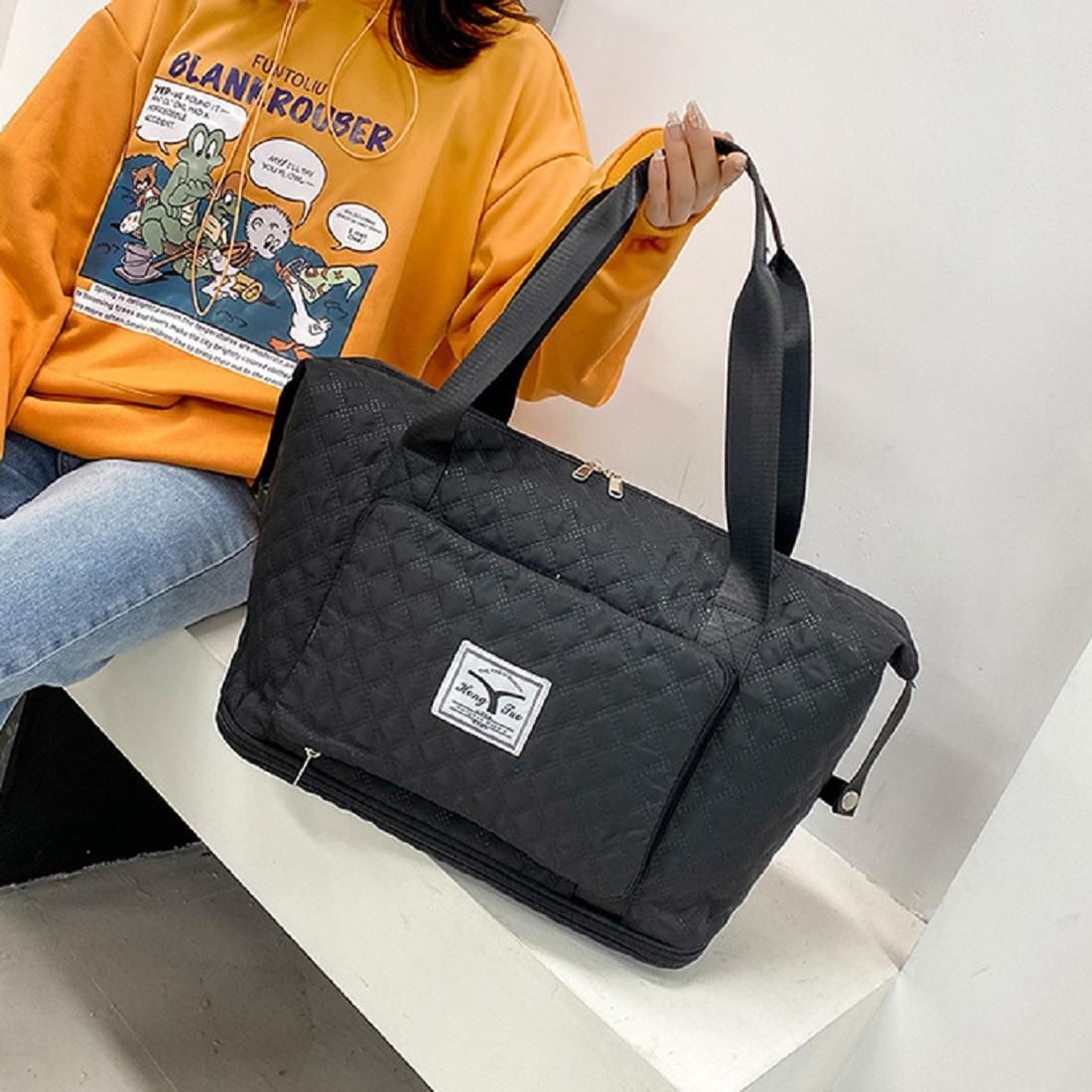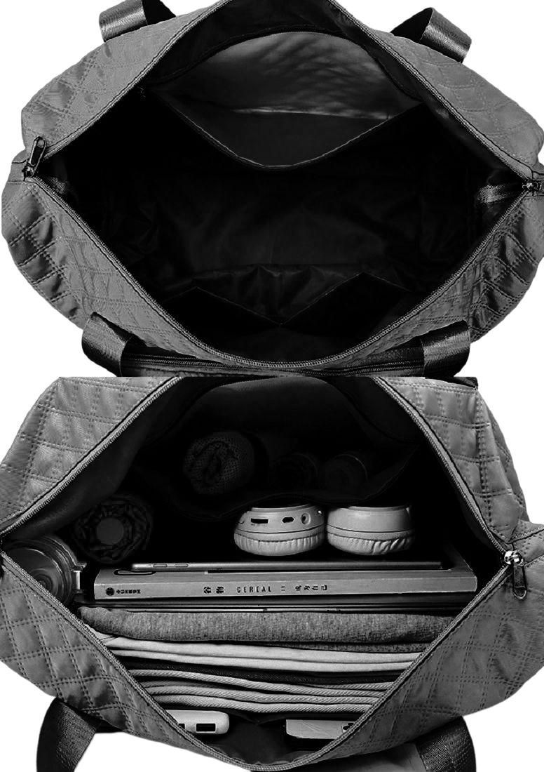 Жіноча сумка Confident TB1-T-229A пошита з міцної чорної стьобаної тканини, з вологовідштовхуючими властивостями. Розміри: 40 x 21 x 28см. Має одне основне відділення на блискавці, всередині якого розташовані дві невеликі кишеньки для дрібних предметів. Із зовнішнього лицьового боку також є нашивна кишеня на змійці. З тильного боку функціонал сумки виконаний таким чином, щоб її можна було надіти на ручку валізи і взяти з собою в дорогу. Трансформація цієї моделі полягає у можливості збільшити її довжину за необхідності, розкривши блискавку знизу виробу. Підкладка: текстиль. Колір чорний. Колір фурнітури чорний.