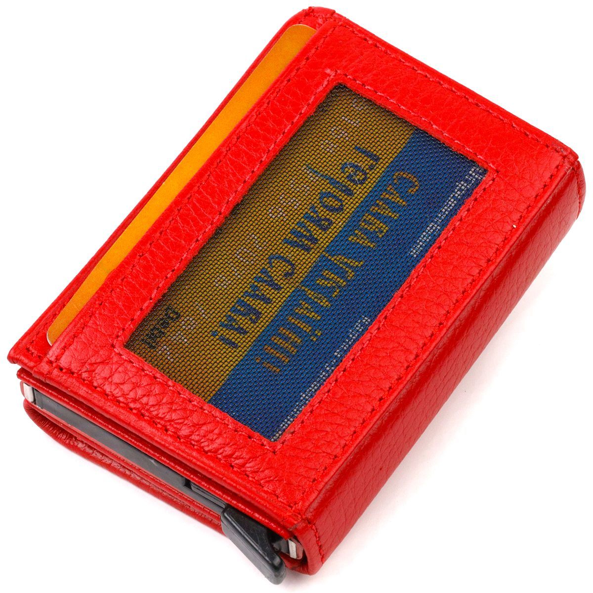 Яркий картхолдер из натуральной кожи, для настоящих деловых женщин, предназначен для хранения банковских и дисконтных карт и небольшого количества наличных денег. Имеет лаконичный дизайн, отлично ложится в руку, помещается в карман, а также в любую сумку. Кожа мягкая, приятная на ощупь. Механизм работает надежно и удобен в использовании; карточки хорошо закреплены в аксессуаре. Отличная идея для подарка близкому человеку.