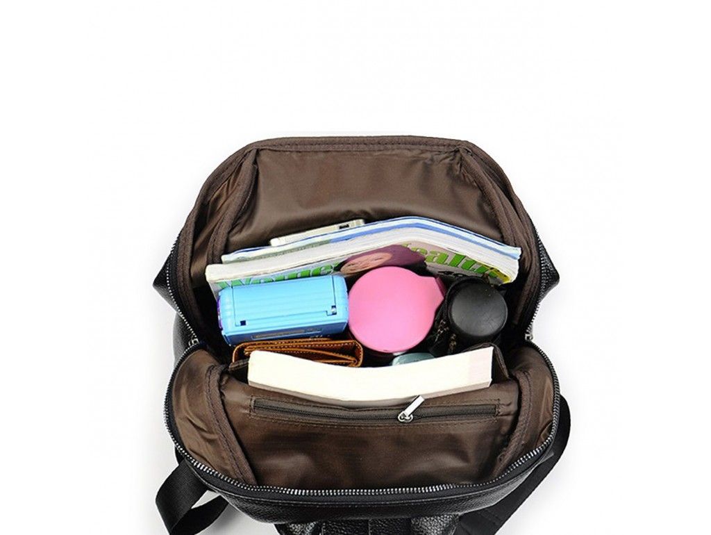 Жіночий середній рюкзак міського типу Olivia Leather NWBP27-7729A-BP виготовлений з натуральної шкіри, має зернисту структуру. Особливості: розміри рюкзака становлять 29 х 33 х 14,5 см. Рюкзак має одне головне відділення яке закривається на блискавку. Всередині рюкзака розташовані три невеликих кишені відкритого типу і дві кишені на блискавці. Розмір бокової кишені на блискавці становить 15х13 см, розмір накладного кишені на блискавці 16х14 см. З лицьового боку розташовані дві кишені, верхній накладної на блискавці має розмір 22х12 см, горизонтальна кишеня на блискавці має розмір 16х7 см. З задньої частини розташована кишеня на блискавці з розміром 15х16 см. З боків розташовані кишені на блискавці для різних дрібниць. Рюкзак має м'яку структуру. Підкладка - текстиль. Плечовий текстильний ремінець зі шкіряною вставкою регулюється по довжині, в діапазоні 60-100 см. Ручка сумки щільна. Колір чорний. Колір фурнітури: темне срібло.
