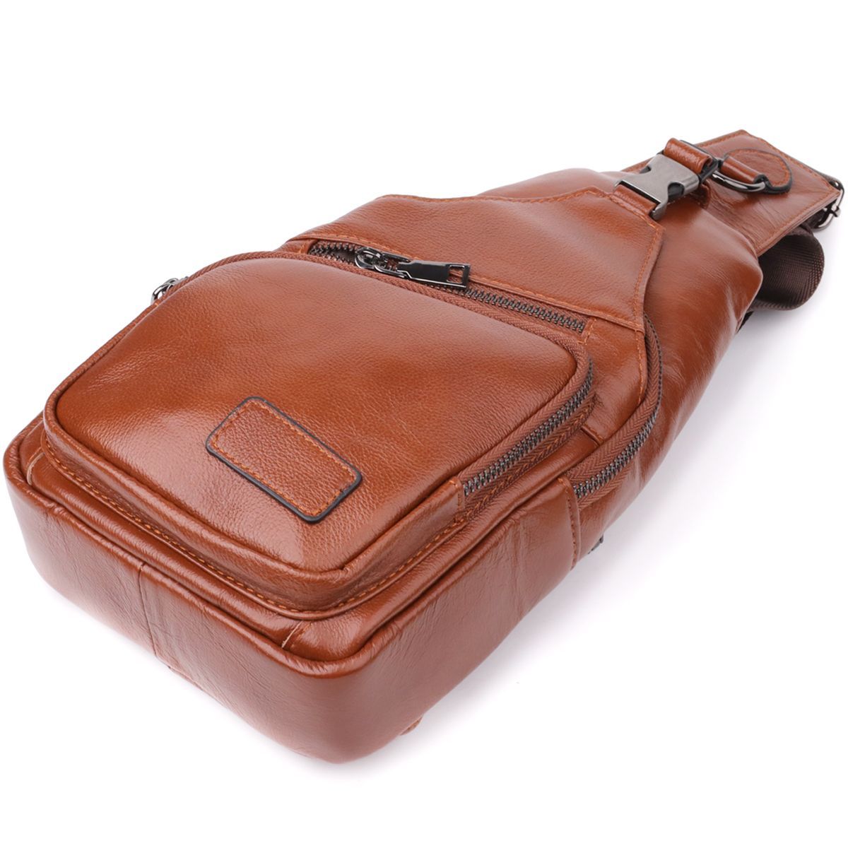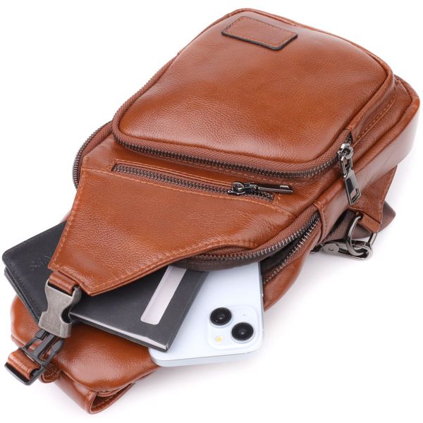 Чоловіча шкіряна сумка через плече відрізняється продуманим дизайном та функціональністю. Одне основне відділення на блискавці забезпечує надійне зберігання речей. Усередині розташовані дві кишені — одна на блискавці для цінних предметів і одна відкритого типу для швидкого доступу.
