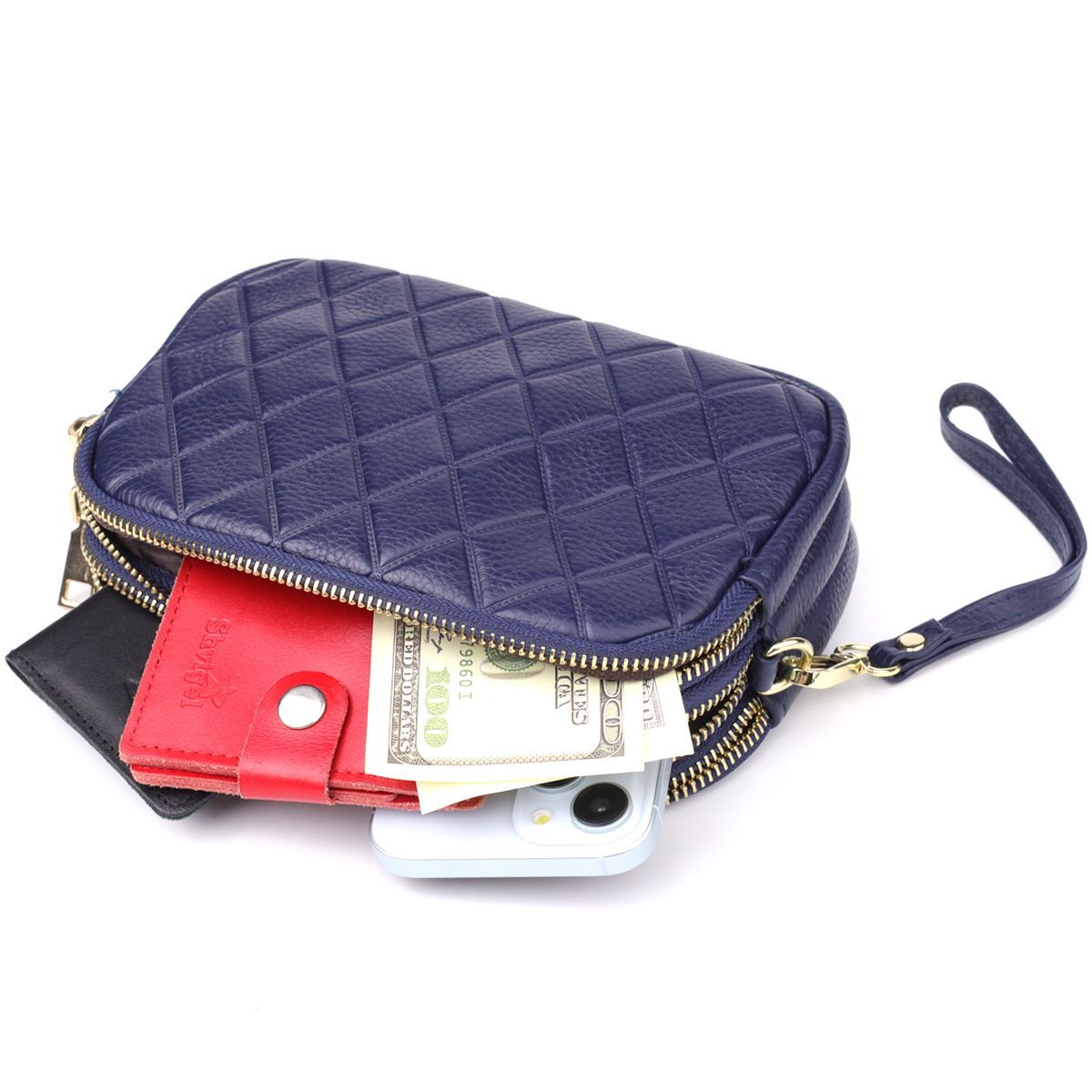 Функціональна конструкція включає три окремі відділення, кожне з яких закривається на блискавку. Це забезпечує ідеальну організацію внутрішнього простору: зручно розподіляйте документи, косметику, гаджети та особисті речі без зайвого безладдя. Усередині передбачена потайна кишеня на блискавці, що ідеально підходить для зберігання особливо цінних дрібниць.