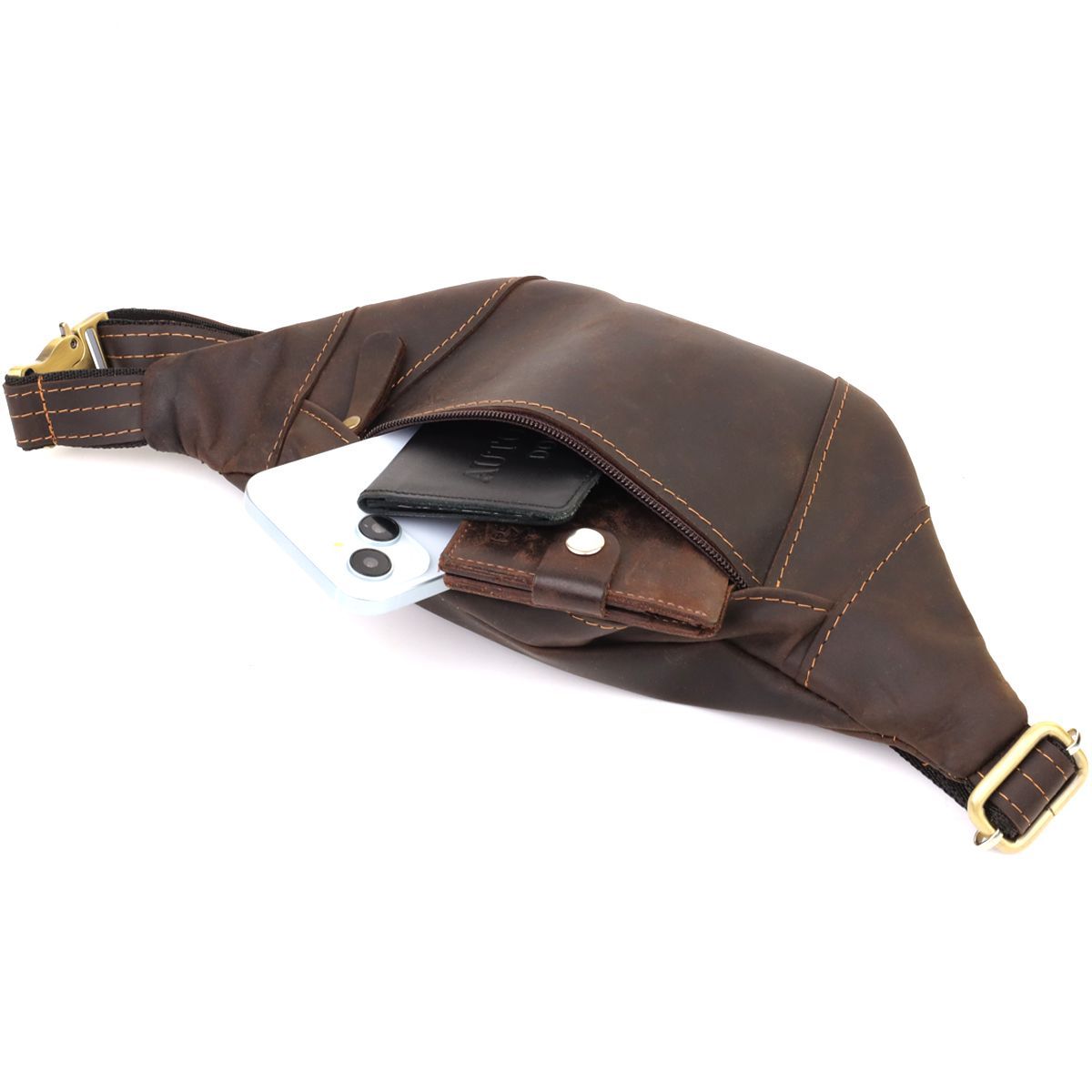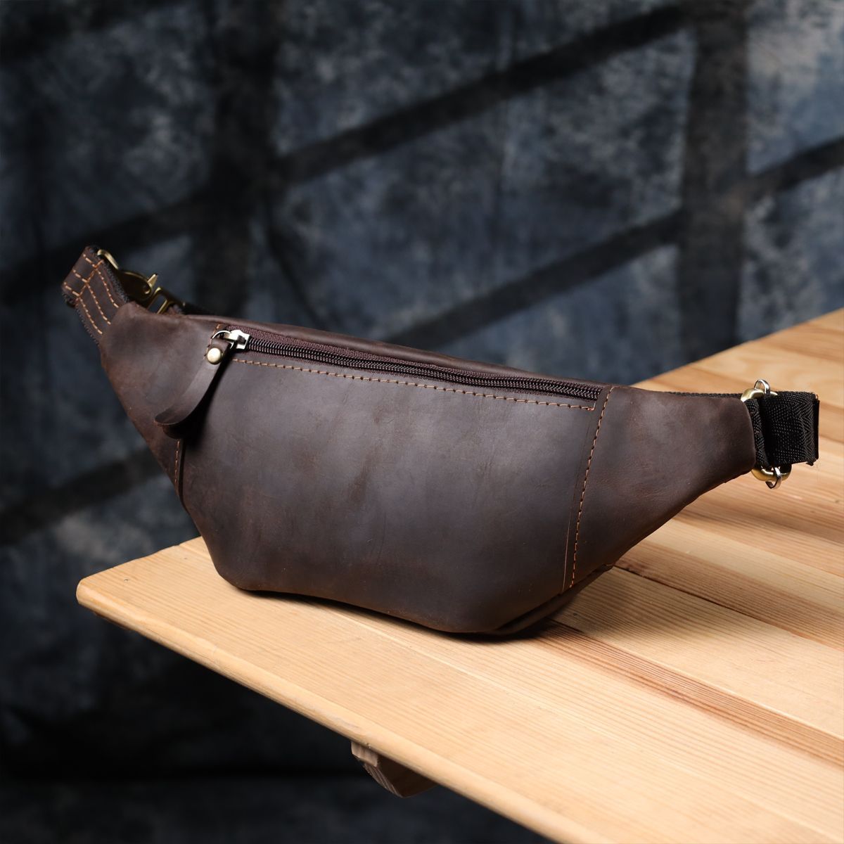 Виконана з міцної натуральної вінтажної шкіри, доповнена надійною металевою фурнітурою та ременем, що регулюється. Ідеальний дизайн робить її стильним рішенням для чоловіка. Лаконічний дизайн і увага до деталей роблять її універсальною: чи то поїздка, прогулянка містом чи ділова зустріч — аксесуар виглядатиме доречно в будь-якій ситуації.