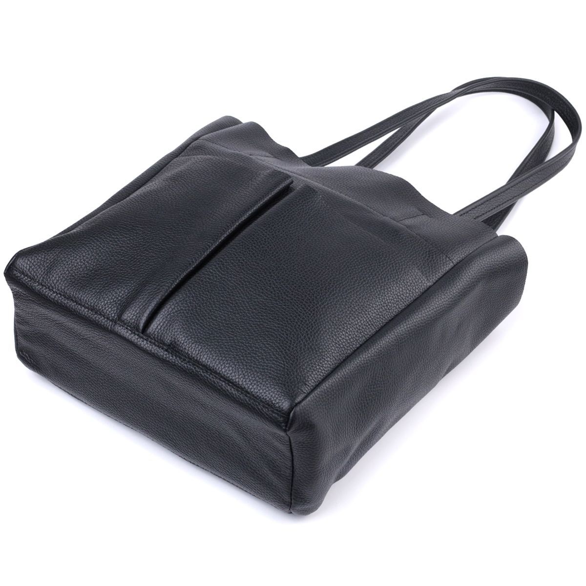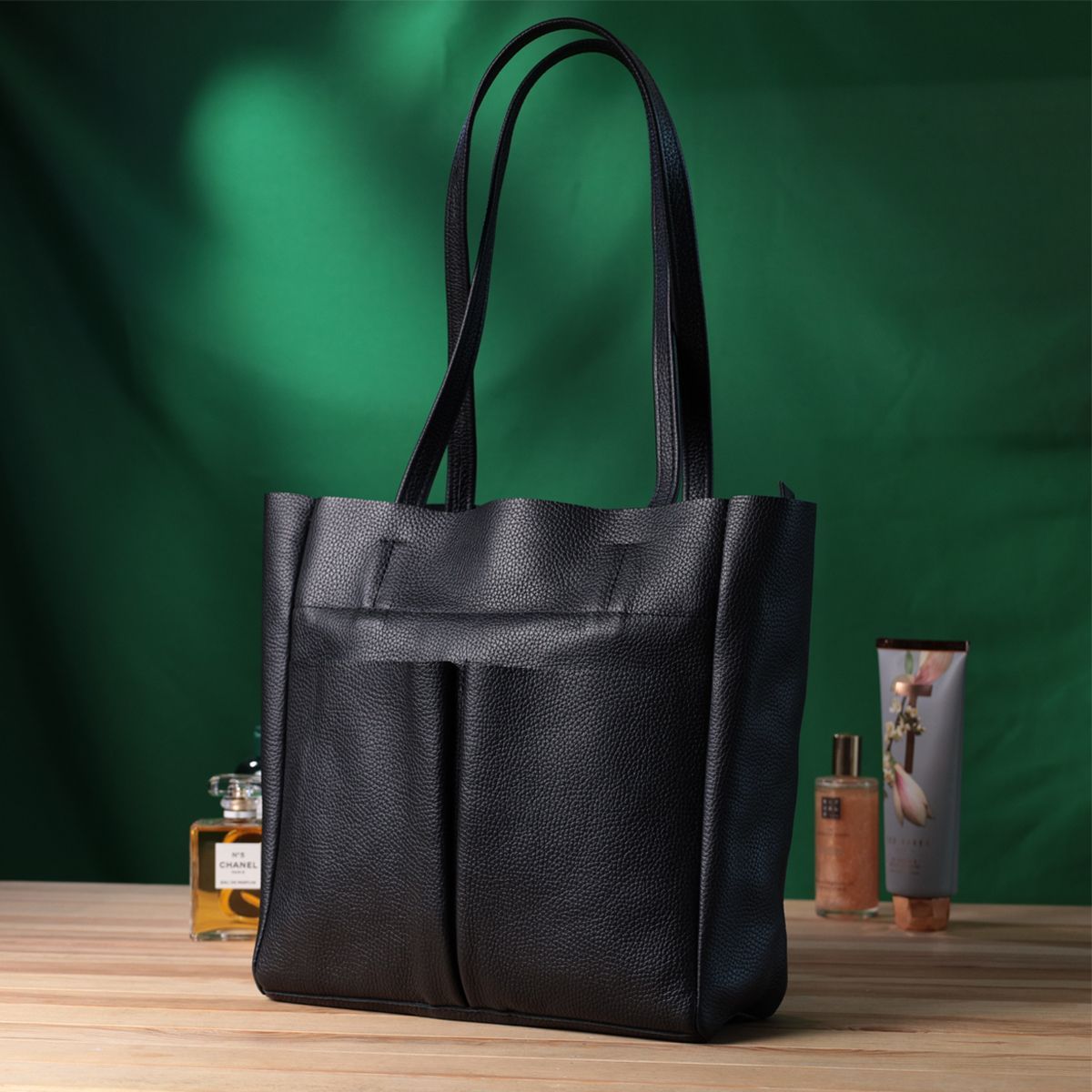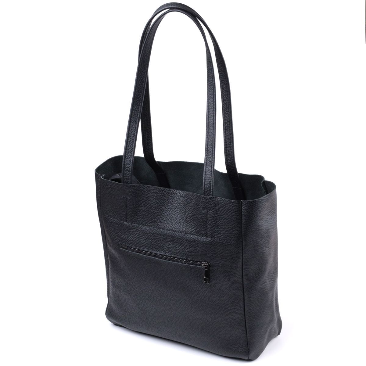 Функціональна жіноча сумка для тих, хто завжди носить із собою величезну кількість речей. Таку сумку можна спокійно носити на роботу, в неї добре поміщаються всі особисті речі і папки з документами. Також таку модель зручно брати із собою у подорожі та виглядати завжди стильним та елегантним. Колір моделі – чорний, фактура – зерниста. Матеріал виконання – натуральна шкіра з високими показниками стійкості до зношування. Для перенесення використовуються дві міцні надійні ручки. Сумка має знімне ущільнене дно прямокутної форми, щоб надати за бажанням більш чітких форм аксесуару. Фурнітура срібного кольору – стійка не змінює свій колір у процесі носіння. Аксесуар чудово поєднується з усіма стилями в одязі та може стати чудовим подарунком на будь-яке свято.