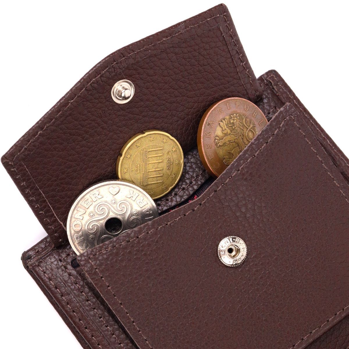 - монетница, закрывающаяся клапаном на кнопку;
