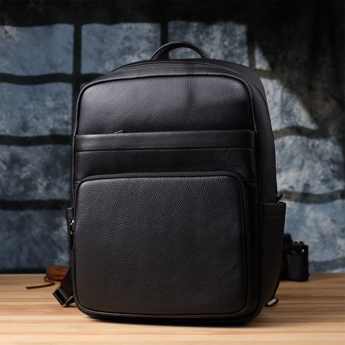 Великий шкіряний рюкзак створений для тих, хто цінує комфорт та функціональність. Він оснащений одним просторим основним відділенням на блискавці з двома бігунками, всередині якого знаходяться дві кишені відкритого типу і одна кишеня на блискавці для зручної організації дрібних речей. На лицьовій стороні розташовані накладна і вбудована кишені, що закриваються на блискавку, а з боків — дві додаткові кишені для аксесуарів та пляшки води.